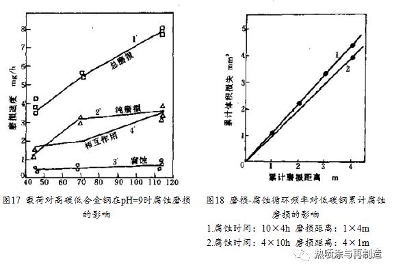 在單純的腐蝕作用中,失重與腐蝕時(shí)間的關(guān)系通常是凹曲線,而一般的干磨損(在空氣中磨損)材料流失量與載荷(速度)大多呈線性關(guān)系。腐蝕磨損則不符合這兩種規(guī)律,它們間的交互作用通常都表現(xiàn)為加速, 用下式表示: