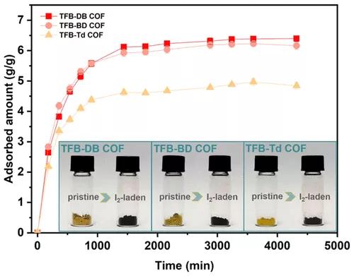 核廢料中的放射性物質(zhì)會對人類的生殖和代謝系統(tǒng)等健康造成危害。如何快速高效地設計放射性物質(zhì)吸附劑仍然是一個巨大的挑戰(zhàn)。這項成果提出了一種通過理論篩選設計高效放射性碘吸附劑的策略。三種經(jīng)過篩選的COFs表現(xiàn)出超高碘吸附能力,由于其具有特定的孔徑和官能團,蒸汽中的碘吸附量高達6.4 g/g(質(zhì)量百分比為640%),溶液中則高達99.9 mg/g。