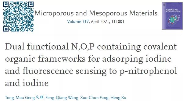8. Microporous Mesoporous Mater.: 含N,O,P的雙功能共價有機框架用于吸附碘及對硝基苯酚和碘的熒光傳感