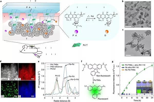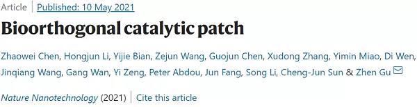 過渡金屬介導的生物正交催化激發(fā)了人工化學的一個新分支,與酶促反應互補,使生物分子的選擇性標記或通過非自然過程原位合成生物活性劑成為可能。然而,由于金屬毒性的安全問題和催化劑的應用過程復雜等原因,生物正交催化在體內(nèi)的有效應用仍然具有挑戰(zhàn)性。基于此,浙江大學顧臻教授(通訊作者)等人報道了一種具有生物正交催化活性的微針陣列貼片裝置。作者以聚乙烯醇(PVA)為基體,沉積有鈀納米粒子(Pd NPs)的TiO2納米片(Pd-TNSs)為納米填料,制備了該微針陣列貼片裝置。其中,摻入Pd-TNSs可以增強微針在干玻璃狀態(tài)下的力學性能,賦予它們足夠的強度,以微創(chuàng)的方式穿透皮膚。當置于水環(huán)境中時,微針就會變成膨脹的水凝膠狀態(tài),形成多孔結(jié)構(gòu)。因此,三個層次的結(jié)構(gòu)層次,即三維(3D)針陣列、每個針基質(zhì)中的微孔和網(wǎng)絡中高度暴露的Pd-TNSs表面,促進了籠狀分子的擴散以與Pd納米粒子接觸,從而促進了它們的活化。需注意,通過使用小鼠黑色素瘤模型,證明了系統(tǒng)給藥的前藥N-烯丙基氧羰基籠狀阿霉素(alloc-DOX)的局部腫瘤內(nèi)活化,不僅能夠增加劑量,而且限制了對健康器官和組織的副作用。此外,Pd-TNSs與PVA之間的界面相互作用以及PVA鏈形成的氫鍵使得微針針尖在水合物狀態(tài)下具有足夠的力學韌性,從而易于去除整個貼片,而不會留下有害的過渡金屬(TMs)或引起炎癥。