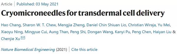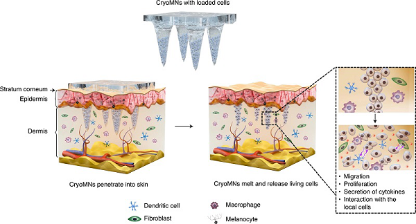 研究發(fā)現(xiàn),簡單、安全和有效的治療細胞的透皮遞送技術(shù)有助于治療皮膚疾病的細胞療法。通過皮下注射針頭的常規(guī)細胞遞送與患者依從性差有關(guān),存在需要經(jīng)過培訓的人員、產(chǎn)生廢物且具有不可忽視的傷害和感染風險的問題?;诖耍?/span>香港城市大學Chenjie Xu(通訊作者)等人報道了一種冷凍微針貼片的設(shè)計和概念應用,并且該冷凍微針貼片可用于活細胞的透皮傳遞。這種微針是用預先懸浮的細胞在低溫培養(yǎng)基中進行分步低溫微模塑法制備而成,在細胞復蘇后可以很容易插入豬皮中溶解。在小鼠體內(nèi),冷凍微針遞送的細胞保留了它們的生存能力和增殖能力。在患有皮下黑色素瘤的小鼠中,通過冷凍微針遞送的卵清蛋白脈沖的樹突狀細胞引起了更高的抗原特異性免疫反應,并且導致腫瘤生長比靜脈和皮下注射的細胞更慢。具有生物相容性的冷凍微針可促進微創(chuàng)細胞遞送,用于一系列的細胞治療。