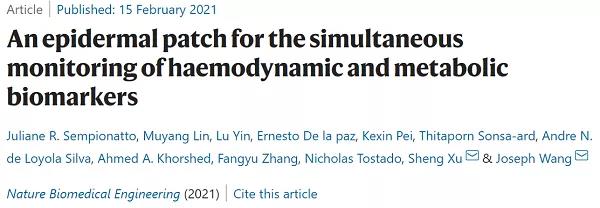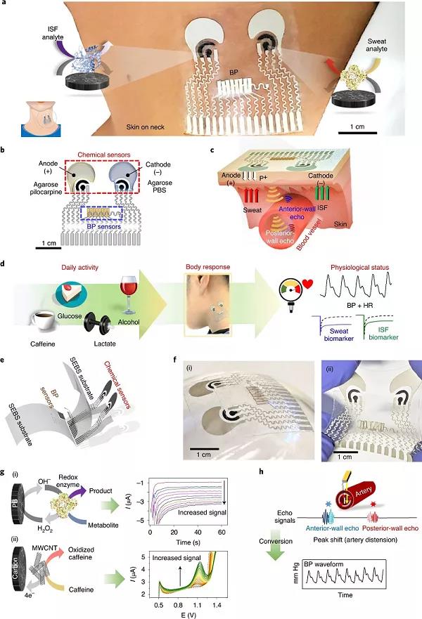 為了監(jiān)測日?;顒訉θ梭w生理反應的影響,需要一種能夠同時跟蹤代謝和血流動力學參數(shù)的可穿戴器件?;诖?,美國加州大學圣地亞哥分校Joseph Wang和Sheng Xu(共同通訊作者)等人報道了一種非侵入性皮膚穿戴器件,通過超聲波傳感器同時監(jiān)測血壓和心率,并通過電化學傳感器同時監(jiān)測多種生物標志物。作者優(yōu)化了集成器件,使其在符合彎曲皮膚表面的同時提供力學彈性和靈活性,并且確保可靠地感知組織間液中的葡萄糖和汗液中的乳酸、咖啡因和酒精,而各個傳感器之間沒有串擾。在人類志愿者身上,該器件捕捉到了食物攝入和運動的生理效應,特別是在食物消化后葡萄糖的產(chǎn)生,通過糖酵解消耗葡萄糖,以及血壓和心率的增加,以補償氧氣的消耗和乳酸的產(chǎn)生。通過集成的可穿戴器件進行連續(xù)、同步的聲學和電化學傳感,可以豐富對人體日?;顒禹憫睦斫猓⑶矣兄趯Ξ惓I碜兓脑缙陬A測。