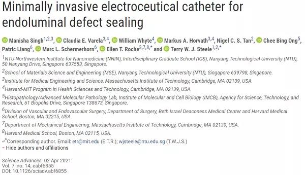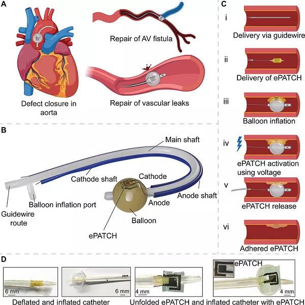 腔內(nèi)缺損的外科手術(shù)修復與圍手術(shù)期發(fā)病率和死亡率有關(guān)。利用組織粘合劑進行血管內(nèi)修復可以減少宿主組織損傷,但是目前的生物粘合劑設(shè)計不支持微創(chuàng)部署。其中,電壓激活的組織粘合劑為腔內(nèi)修復提供了一種新的策略。為了促進電壓激活粘合劑的臨床轉(zhuǎn)化,新加坡南洋理工大學Terry W. J. Steele和麻省理工學院Ellen T. Roche(共同通訊作者)等人報道了將一種電壓激活貼片(ePATCH)與一種帶有可拉伸電極的微創(chuàng)導管(CATRE)配對,以對抗體內(nèi)和體外管腔缺陷的修復。ePATCH/CATRE平臺展示了在濕組織基底上密封直徑高達2 mm的管腔缺損。防水密封件具有柔韌性和回彈力,可承受20000多次生理相關(guān)的應力/應變循環(huán)。當心臟跳動時,ePATCH被電激活,沒有觀察到電信號中斷。ePATCH/CATRE平臺具有廣泛的潛在應用,從假性動脈瘤/瘺的血管內(nèi)治療到生物電極,再到電生理標測。