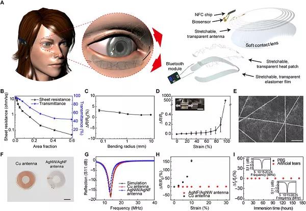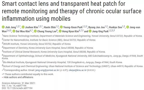 可穿戴電子器件能夠監(jiān)測人體的生理信號,提供生物醫(yī)學信息,已成為可持續(xù)的個人健康管理領(lǐng)域的熱點?;诖?,韓國延世大學Jang-Ung Park和韓國慶北大學Hong Kyun Kim(共同通訊作者)等人報道了一種用于無線監(jiān)測和治療慢性眼表炎癥(OSI)的柔性、智能隱形眼鏡和可連接皮膚的治療器件的人類先導性實驗。作為一種診斷器件,這種智能隱形眼鏡能夠使用石墨烯場效應晶體管實時測量淚液中基質(zhì)金屬蛋白酶-9(OSI的生物標志物)的濃度。作為一種治療器件,作者還制備了一種可拉伸、透明的貼片,可以貼附在人眼瞼上。其中診斷和治療器件都可以使用智能手機進行無線通信,從而實現(xiàn)OSI的實時診斷和自動熱療。此外,作者利用活體動物和人體進行的體內(nèi)實驗證實,作為一種無創(chuàng)、可移動的保健解決方案,它們具有良好的生物相容性和可靠性。