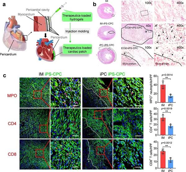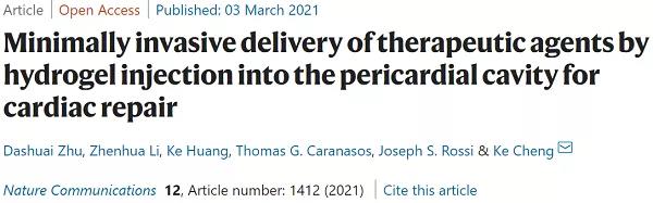 心臟貼片是一種向心臟遞送治療藥物的有效方法。然而,這種手術(shù)通常是侵入性且很難進行的?;诖?,美國北卡羅萊納州立大學Ke Cheng(通訊作者)等人開發(fā)并測試一種方法,利用心包腔作為一個自然模型,在心包內(nèi)注射生物相容性水凝膠中的治療藥物后原位形成心臟貼片。在嚙齒類動物心肌梗死模型中,作者證明了心包內(nèi)注射是一種有效且安全的方法來遞送含有誘導多能干細胞衍生的心臟前體細胞或間充質(zhì)干細胞來源的外泌體的水凝膠。在注射后,水凝膠在心包腔形成心臟貼片狀結(jié)構(gòu),減輕免疫反應,增加治療藥物的心臟滯留時間。通過強大的心血管修復和心外膜源性細胞的刺激,遞送的治療減輕心臟重構(gòu)和改善心肌梗死后心臟功能。此外,作者在臨床相關(guān)的豬模型上證明了微創(chuàng)心包內(nèi)注射的可行性??傊?,該研究證實了心包內(nèi)注射是一種安全有效的方法,可以將治療性水凝膠遞送到心臟進行心臟修復。