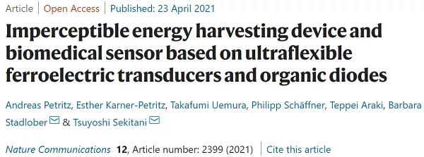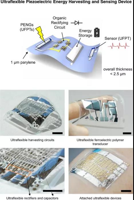 能源自主性和整合性是下一代可穿戴和柔性電子產(chǎn)品的基本要素,用于醫(yī)療保健、機器人和信息物理系統(tǒng)。基于此,日本大阪大學Tsuyoshi Sekitani和奧地利Barbara Stadlober(共同通訊作者)等人首次報道了一種由壓電納米發(fā)電機、二極管整流器和儲能電容組成的綜合性超柔性能量收集器件(UEHD),所有組件的厚度均不超過2.5 μm,在僅1 μm的聚對二甲苯制成的薄基板上制成。當附著在人體皮膚的表面上時難以察覺,作者展示了一種鐵電無線電子保健貼片,可以監(jiān)測脈搏率并測量血壓。納米發(fā)電機和傳感器都是基于P(VDF:TrFE)70:30的超柔性鐵電聚合物傳感器(UFPTs)。同時,結(jié)合了由有機二極管制成的超柔性全波整流器電路,具有短OTFT幾何形狀和超柔性薄膜電容器使用納米氧化鋁薄層。作者采用DNTT(二萘并噻吩)作為有機半導體的二極管顯示出很高的整流比,超過107,并且由于它們的過電壓低于100 mV,因此內(nèi)置的電壓降可忽略不計。其中,UFPTs具有以下優(yōu)點:(1)超柔韌性,使其能夠共形附著于各種材料和表面,并允許將多層UFPTs堆疊在3D形狀的載體上;(2)對平面外(橫向)應力的高靈敏度,可通過多層堆疊提高,從而實現(xiàn)預彎曲橡膠載體上三層堆疊的峰值靈敏度在15 nC N-1范圍內(nèi);(3)極好的機械穩(wěn)定性,允許在40 μm彎曲半徑下穩(wěn)定運行;(4)響應時間非常短,遠低于20 ms N-1。此外,UFPTs用作脈沖電源時,峰值功率密度超過3 mW cm-3。