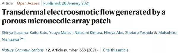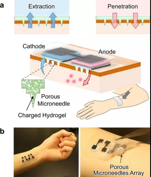 微針陣列是一種具有吸引力的選擇,通過微創(chuàng)手段來突破皮膚屏障進行有效的透皮給藥?;诖?,日本東北大學Matsuhiko Nishizawa(通訊作者)等人報道了一種基于固體聚合物的離子導電多孔微針(PMN)貼片,其可應用于改善離子透入方面,是一種通過皮膚的直流電增強透皮分子傳輸?shù)募夹g(shù)。利用帶電水凝膠修飾的PMN在離子電滲療法中有以下三個創(chuàng)新優(yōu)勢:(1)通過低侵入性穿刺高阻力角質(zhì)層來降低透皮阻力;(2)通過相互連接的微孔輸送大分子;(3)產(chǎn)生電滲流(EOF)。特別是,PMN產(chǎn)生的EOF極大地提高了透皮分子的滲透或提取,類似于由外部壓力引起的流動。作者利用豬皮樣品證明了EOF輔助遞送模型藥物(右旋糖酐)和葡萄糖提取的提高效率。此外,通過內(nèi)置的酶生物電池(果糖/O2電池)為基于PMN的透皮EOF系統(tǒng)供電也被證明是一種可能的全有機離子導入貼片。