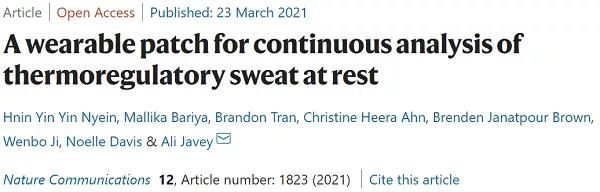 在久坐和日?;顒又?,人體自然持續(xù)地分泌汗液進行體溫調(diào)節(jié),其速率可以反映潛在的健康狀況,包括神經(jīng)損傷、自主神經(jīng)和代謝紊亂以及慢性應激。然而,低分泌率和蒸發(fā)對收集靜止的體溫調(diào)節(jié)汗液進行無創(chuàng)的身體生理學分析提出了挑戰(zhàn)?;诖?,美國加州大學伯克利分校Ali Javey(通訊作者)等人報道了一種可穿戴式的貼片,將其用于在休息時連續(xù)監(jiān)測汗液,使用微流控技術(shù)來防止蒸發(fā),并且實現(xiàn)對分泌速率的選擇性監(jiān)測。作者將用于快速吸汗的親水性填充物集成到傳感通道中,減少了實時測量所需的汗液累積時間。此外,作者還集成了用于pH、Cl-和左旋多巴監(jiān)測的電化學傳感器。作者還展示了與日?;顒?、應激事件、低血糖引起的出汗和帕金森病相關(guān)的動態(tài)出汗分析的貼片功能。通過支持與久坐、常規(guī)和日?;顒蛹嫒莸暮挂悍治?,這些貼片可以在休息時對身體生理進行連續(xù)、自主的監(jiān)測。